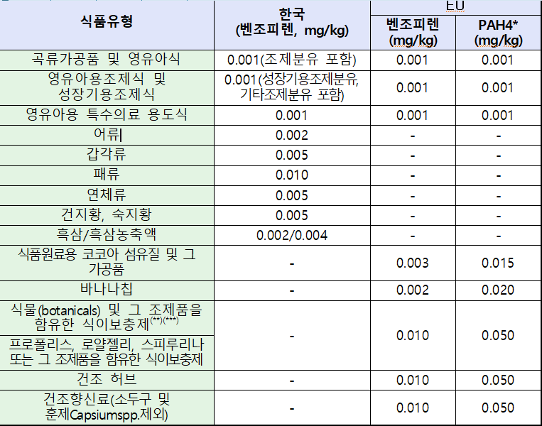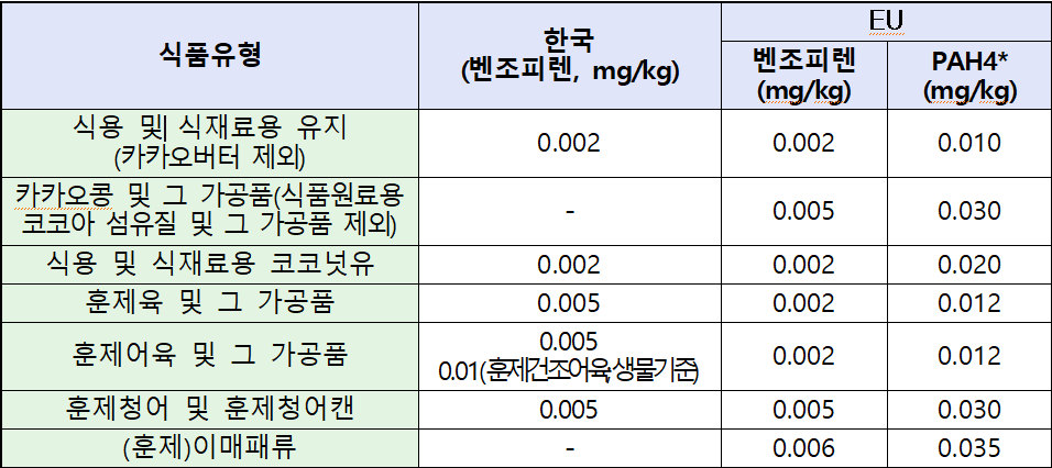 [참고 1] 한국 및 유럽연합 PAH 기준·규격 비교