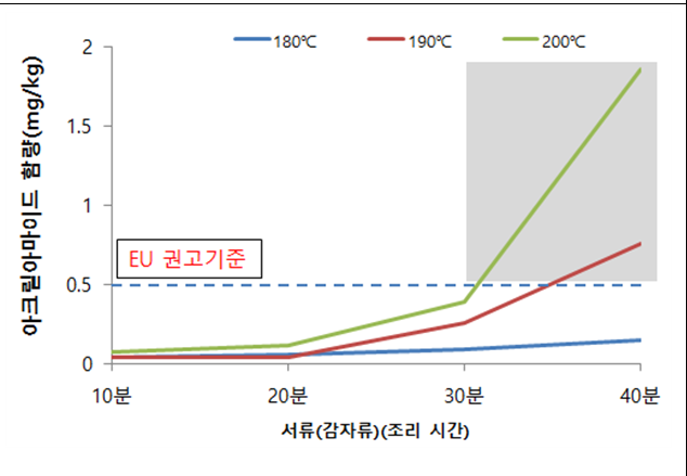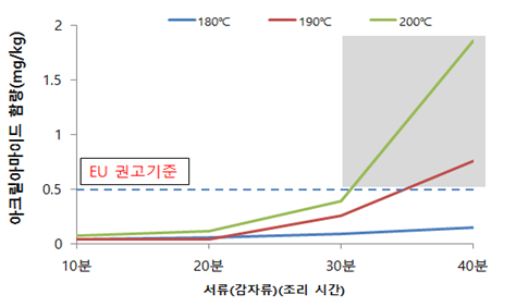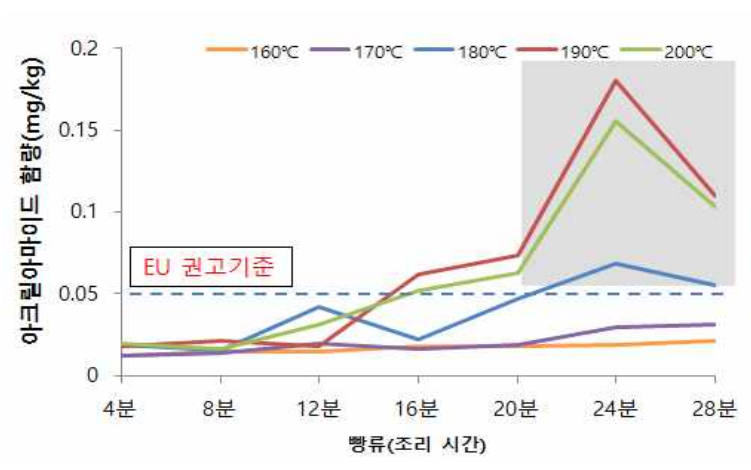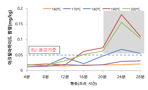A. 200℃로 조리 시 30분까지는 아크릴아마이드가 0.5 mg/kg이하로 생성되었으나 개인별로 차이가 있겠지만 식감이 좋지 않아 가급적 190℃ 이하에서 조리하는 것을 추천해드립니다.