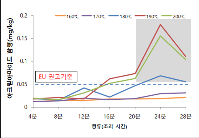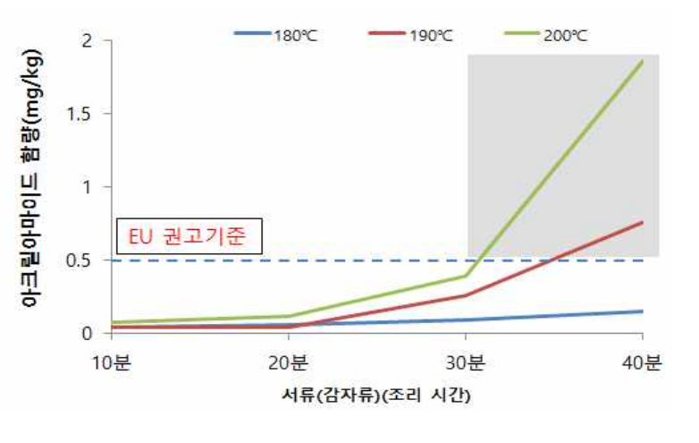 Q9. 그래프상에서 감자튀김을 200℃에서 30분까지 조리한 경우는 아크릴아마이드의 유럽연합 권고기준을 초과하지 않는 것으로 나타났는데 조리 온도를 190℃ 제안한 이유는 무엇인가요?