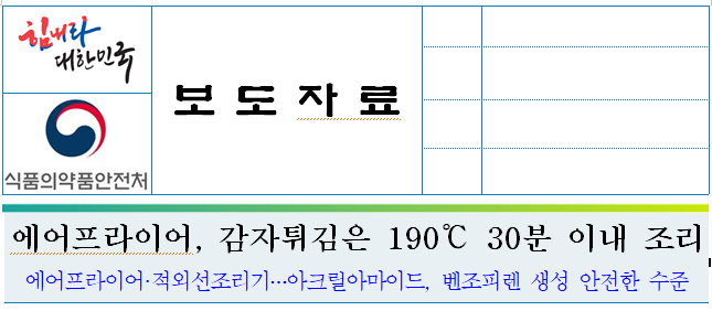 □ 식품의약품안전처(처장 이의경) 식품의약품안전평가원은 에어프라이어‧적외선조리기로 조리한 음식의 유해물질은 안전한 수준이었으나, 감자튀김 등을 에어프라이어로 고온에서 장시간 조리 시 아크릴아마이드 생성량이 증가할 수 있어 주의해야 한다고 밝혔습니다.