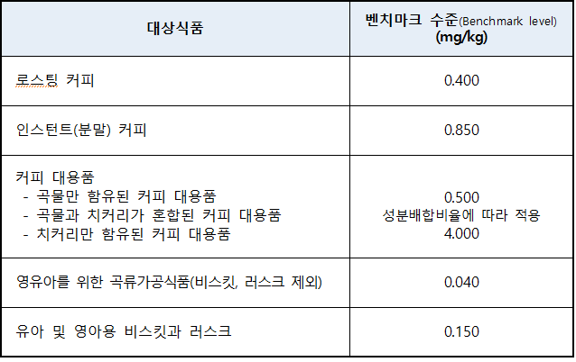 * EU 권고기준 : 식빵(0.05mg/kg), 냉동감자(0.5mg/kg)