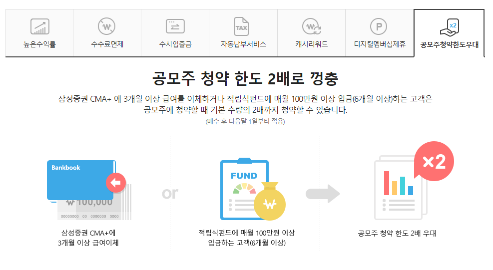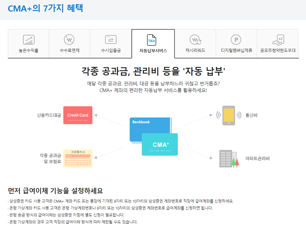 - 캐시리워드 서비스를 신청한 삼성증권 CMA+ 고객 가운데 △급여이체(50만원 이상) △공과금 자동이체(월 1건 이상) 둘 중 하나만 충족하면 됩니다.