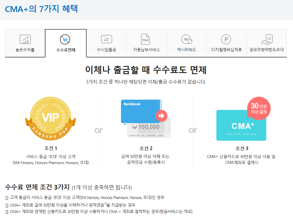 - ① CMA+ 계좌로 매달 50만원 이상 급여이체를 하거나 공적연금1)을 지급받는 경우