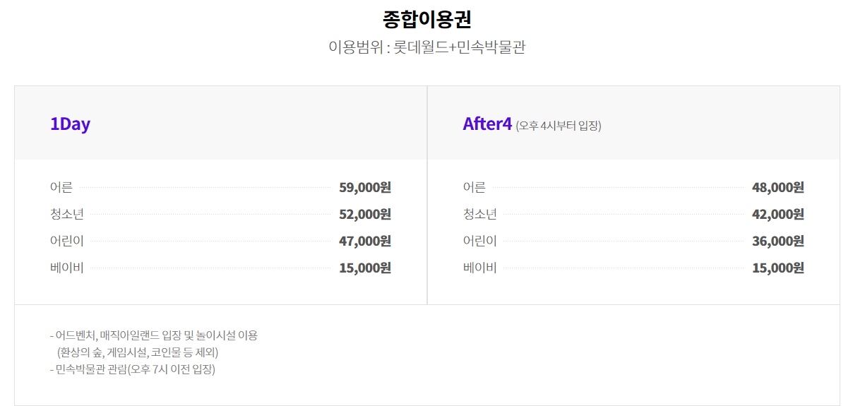 파크이용권(민속박물관만 제외되고 나머지는 종합이용권과 동일합니다.)은