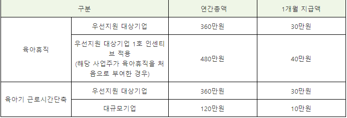 1. 지원대상은 육아휴직 또는 육아기 근로시간 단축을 30일 이상 부여한 사업주