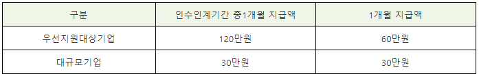 2. 지급금액 : 지급금액은 인수인계 기간중에는 우선지원대상기업의 경우 120만원을 제공하고 그 이후에는 1개월에 60만원씩 지급합니다.