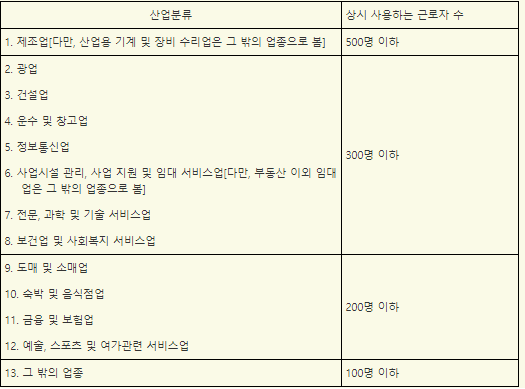 자신이 속한 기업이 제조업이면 500명이하, 광업,건설업, 운수 및 창고업, 정보통신업등이면 300명 이하, 도매 및 소매업이면 200명이하, 그 외에는 100명 이하면 됩니다.