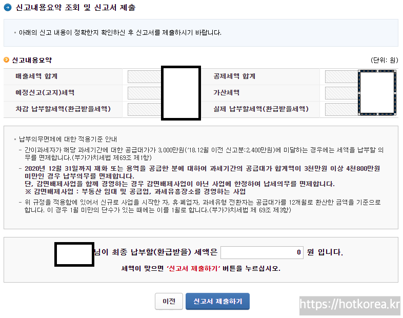 마지막 최종 납부할 세액 0원을 확인 후 신고서 제출하기를 클릭하면 됩니다.