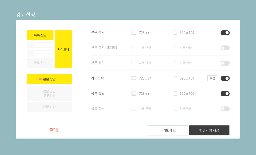 네 맞습니다. 광고 위치와 사이즈 등의 설정 기능은 티스토리와 각 광고 플랫폼 간 논의의 결과입니다. 애드센스에서 본문 중간에 광고를 설정하길 원하실 경우는 "전체 자동 광고"를 사용함으로 설정해 주시면 됩니다. 광고 위치, 광고 제품 등은 의견 수렴을 거쳐 점차 확대하고 개선할 예정입니다.