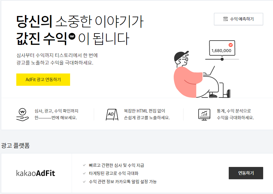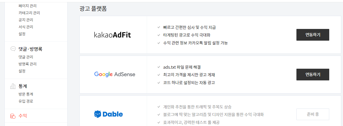 수익메뉴에서 KakaoAdFit 연동하기를 클릭합니다.
