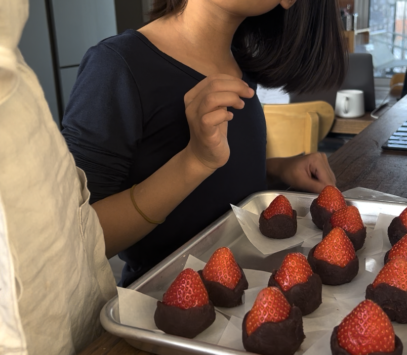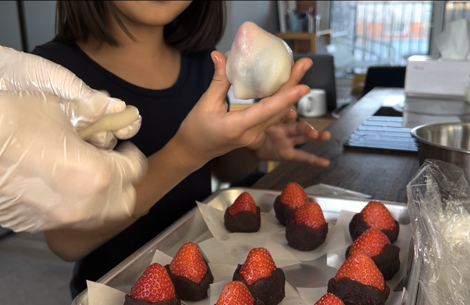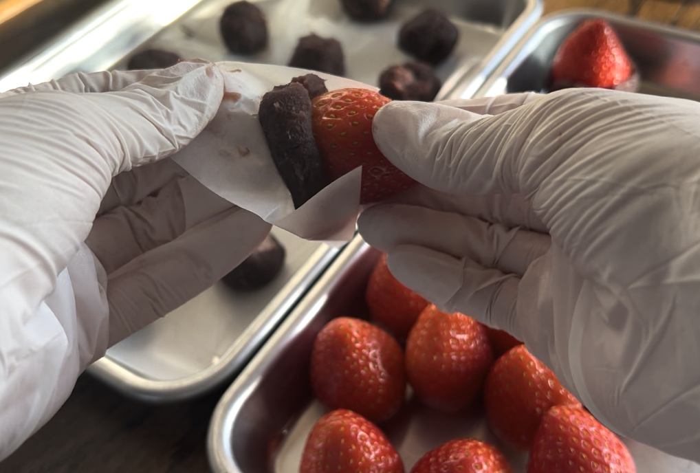 떡을 찔 동안에는 딸기에 적앙금 감싸는 작업을 해준다.