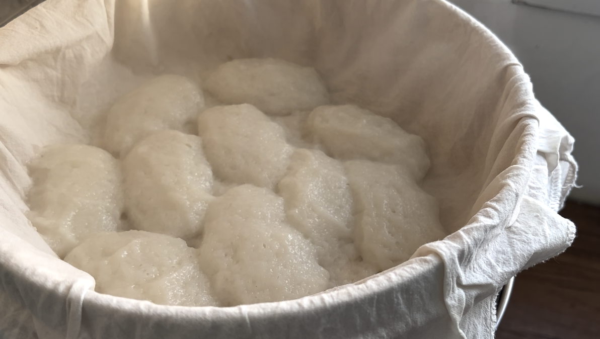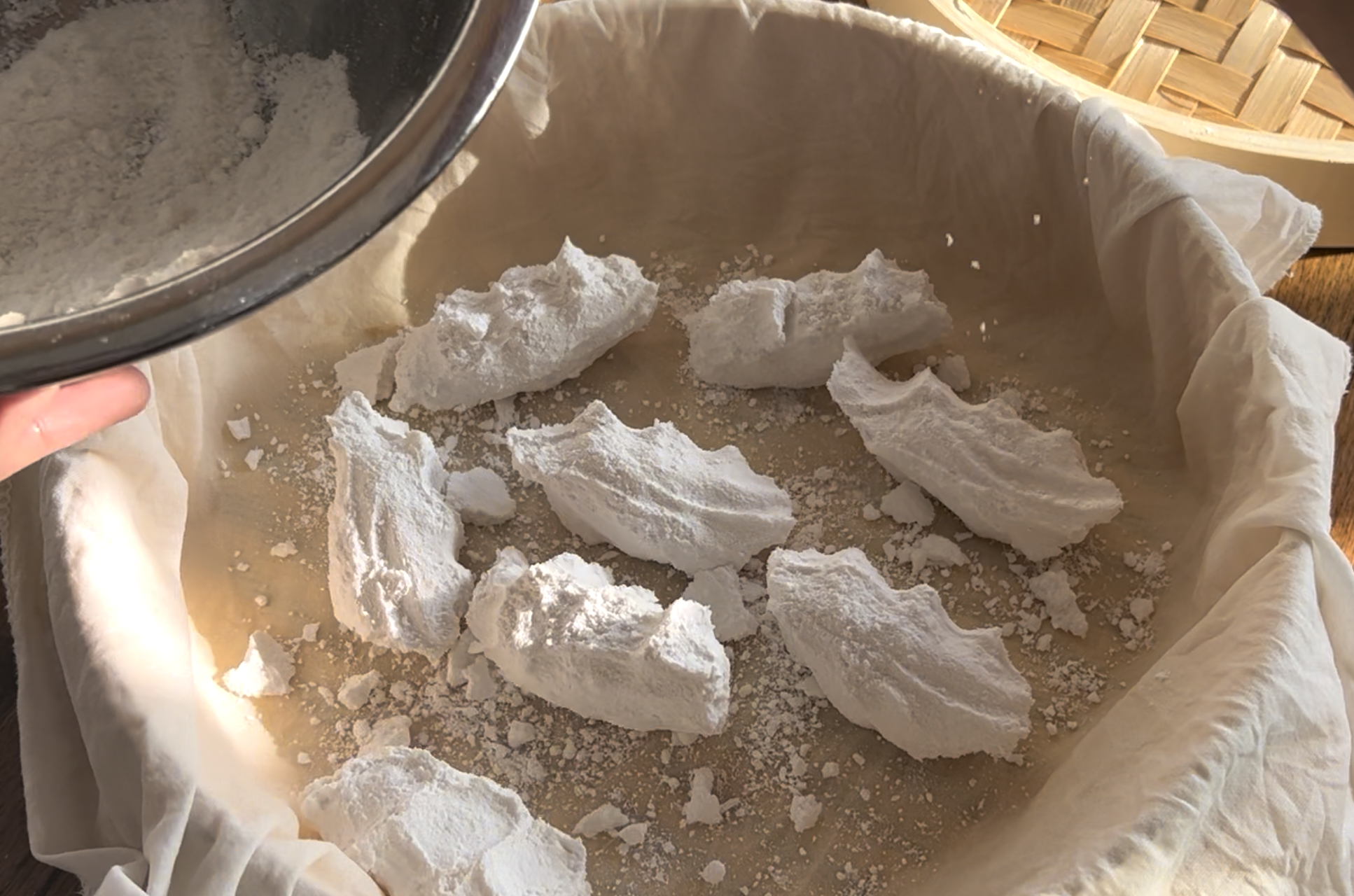 레시피에서 제시된 물과 찹쌀가루를 넣고 함께 손으로 비벼준 다음 위와 같은 모양으로 뭉쳐 군데군데 놓는다.