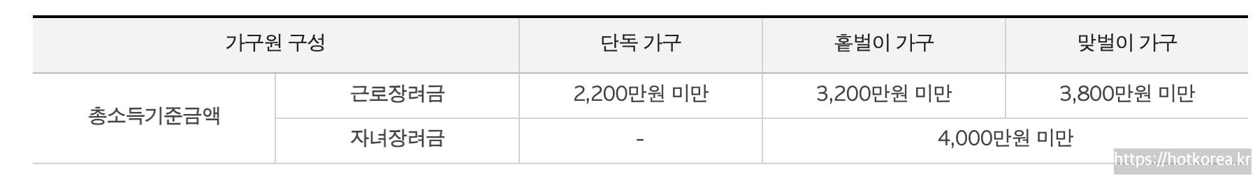 - 홑벌이가구 및 맞벌이구간이 해당되며 4,000만원 미만이어야 함