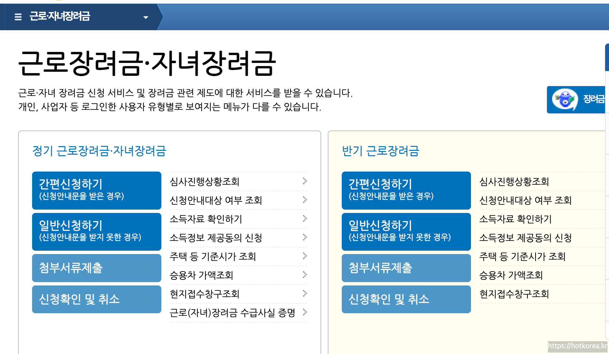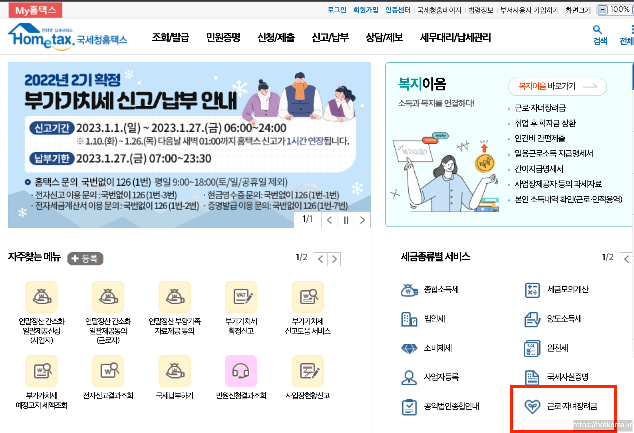 제일 아래 혹은 배너의 근로, 자녀 장려금 신청 클릭