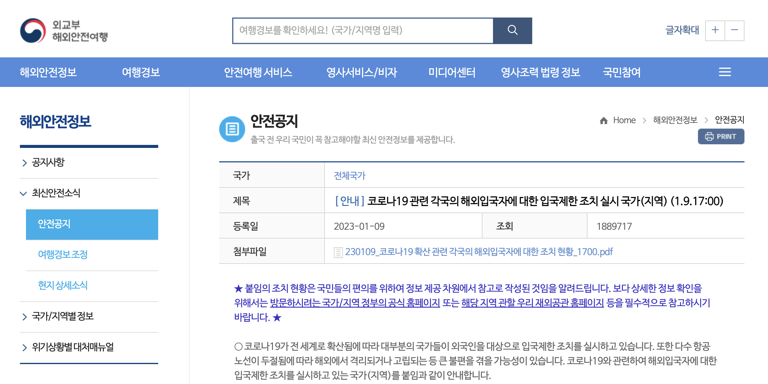 각 나라 입국시 규제는 외교부에서 확인이 가능하다.
