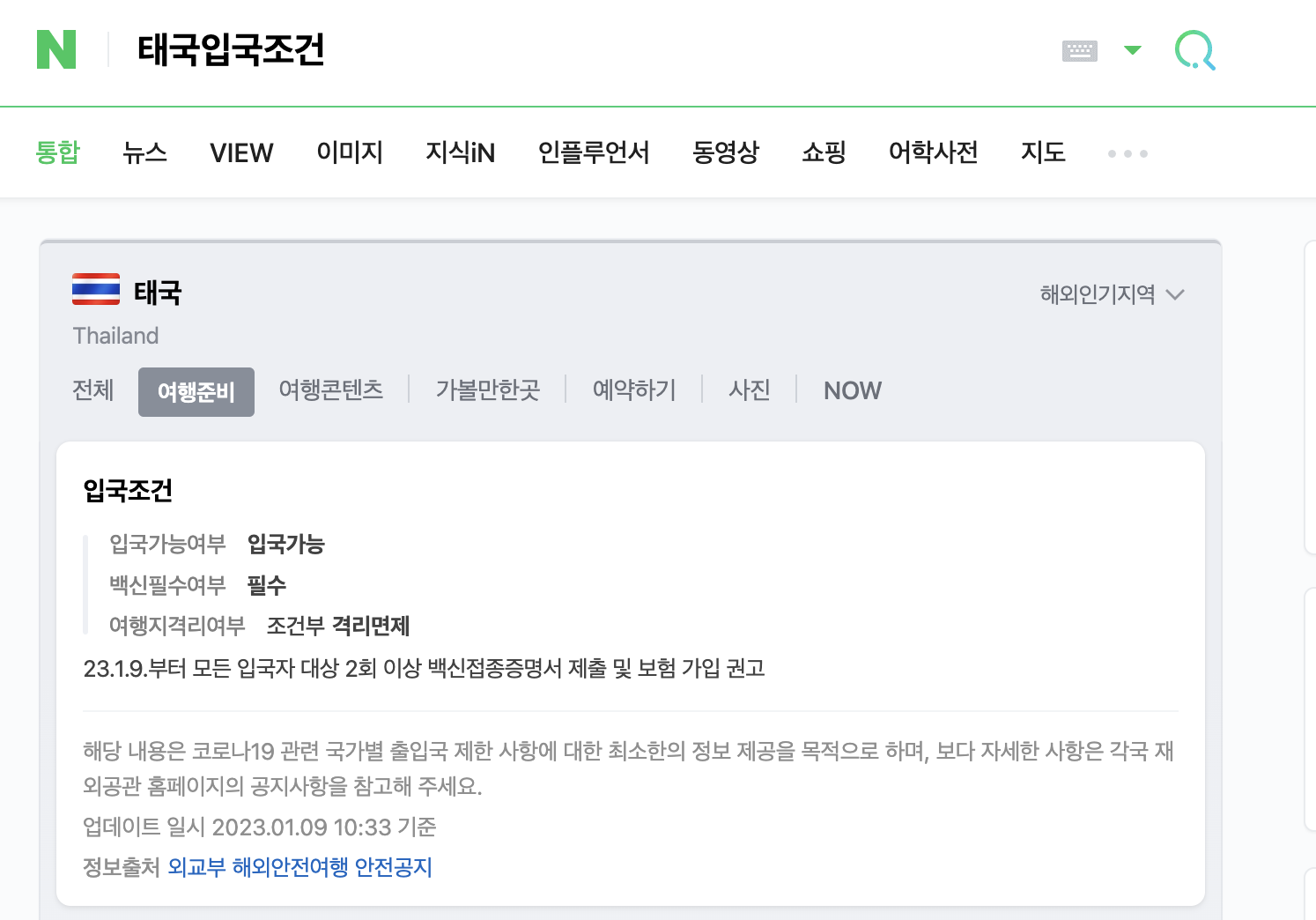- 대략 이렇게 검색해보면, 태국입국조건. 23년 1월 8일부터 백신접종증명서 제출이 의무화 한걸 알 수 있다.