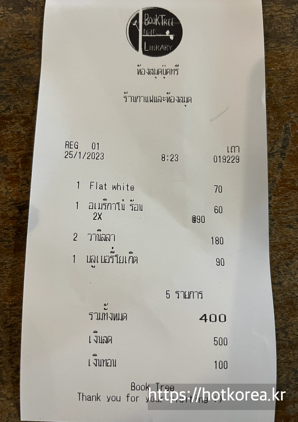 택시 타고 도착했기 때문에 투어 시작시간 보다 1시간정도 일찍 도착했다. 바로 옆에 이런 북까페가 있다. 굉장히 분위기가 괜찮다. 커피도 꽤나 고급스럽다. 태국에서 맛보기 힘든 커피맛이다. 아메리카노와 플랫화이트 그리고 아이스크림을 시켜봤다. 가격은 플랫화이트가 70바트(3천원 조금 안되는 가격) 그리고 수제 아이스크림 3개를 시켰다. (수제 아이스크림은 90바트니 대략 3300원정도?)