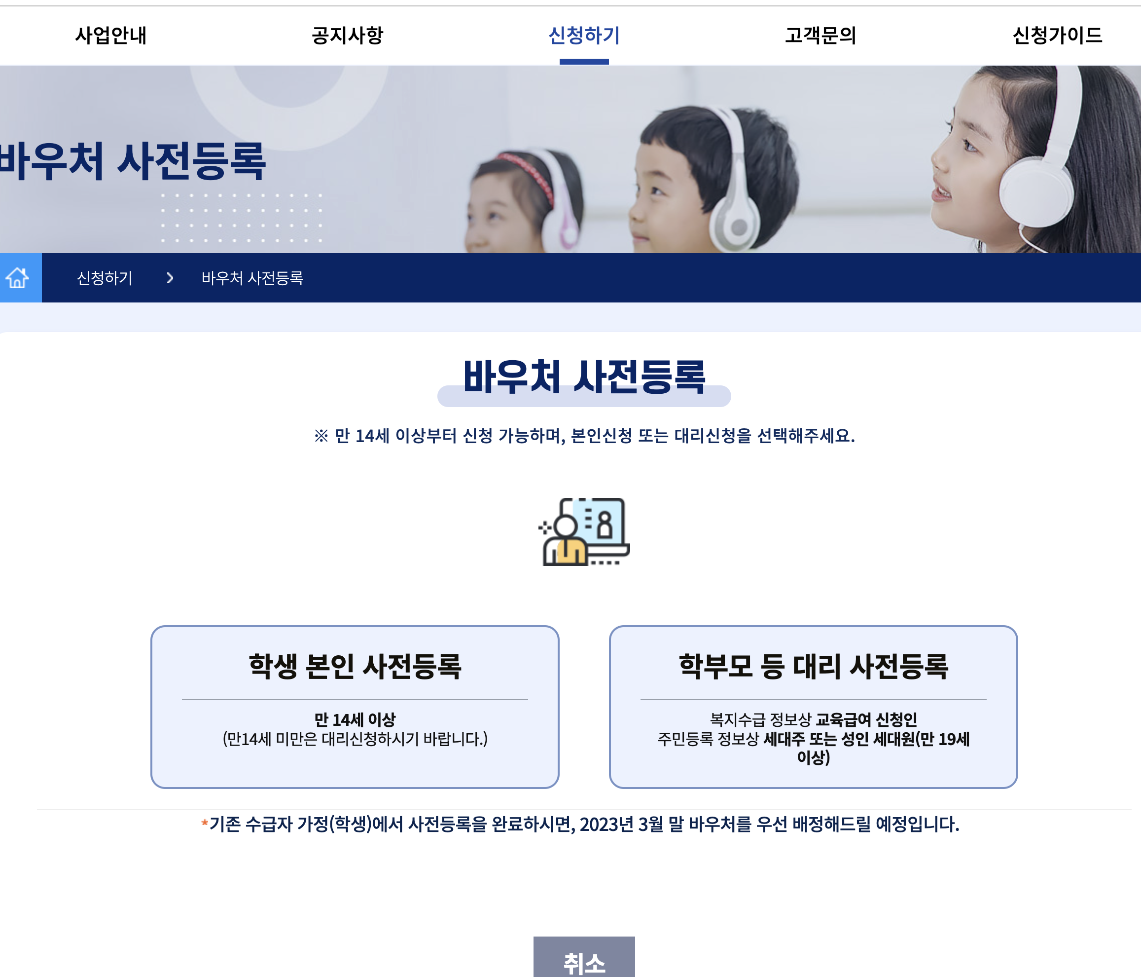 - 기존 수급 가정(학생)이 신청 가능하며, 신청을 완료한 경우 '23년 3월 중 바우처 우선 배정