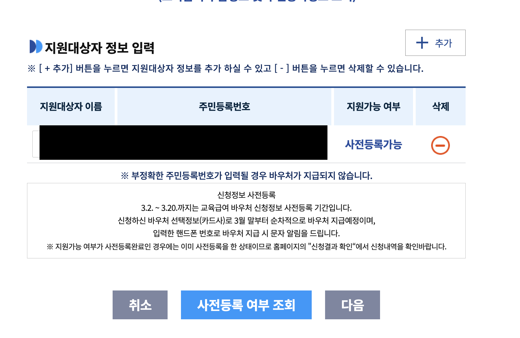 3.2~3.20일까지 사전등록 기간이므로 자녀들의 이름 주민번호 입력후 검색 하면 지원가능여부를 알려줍니다.