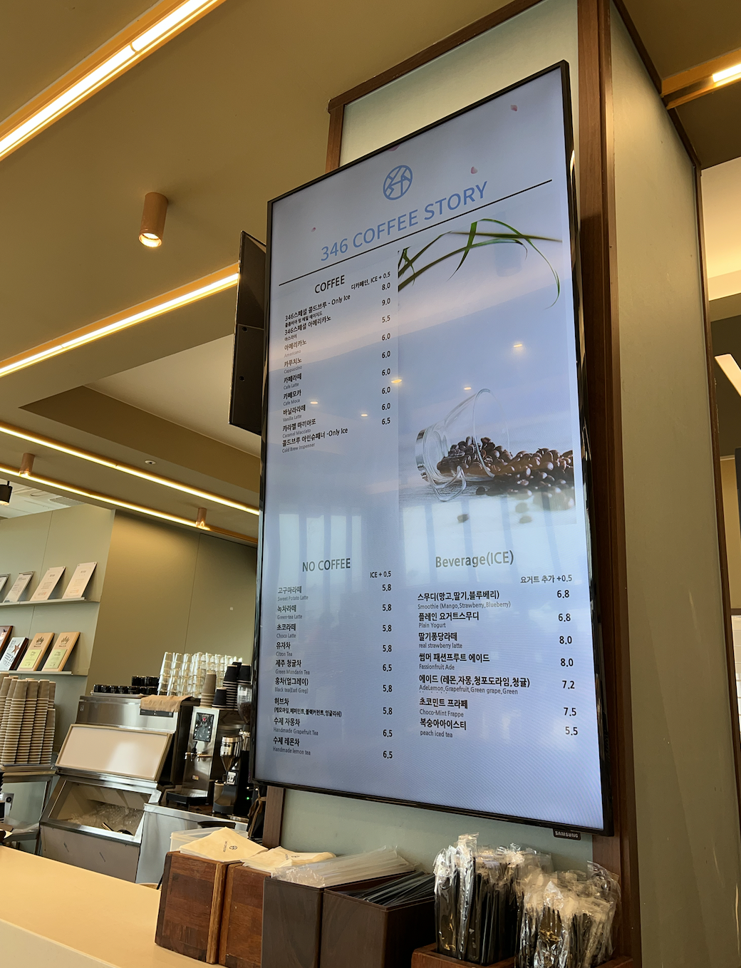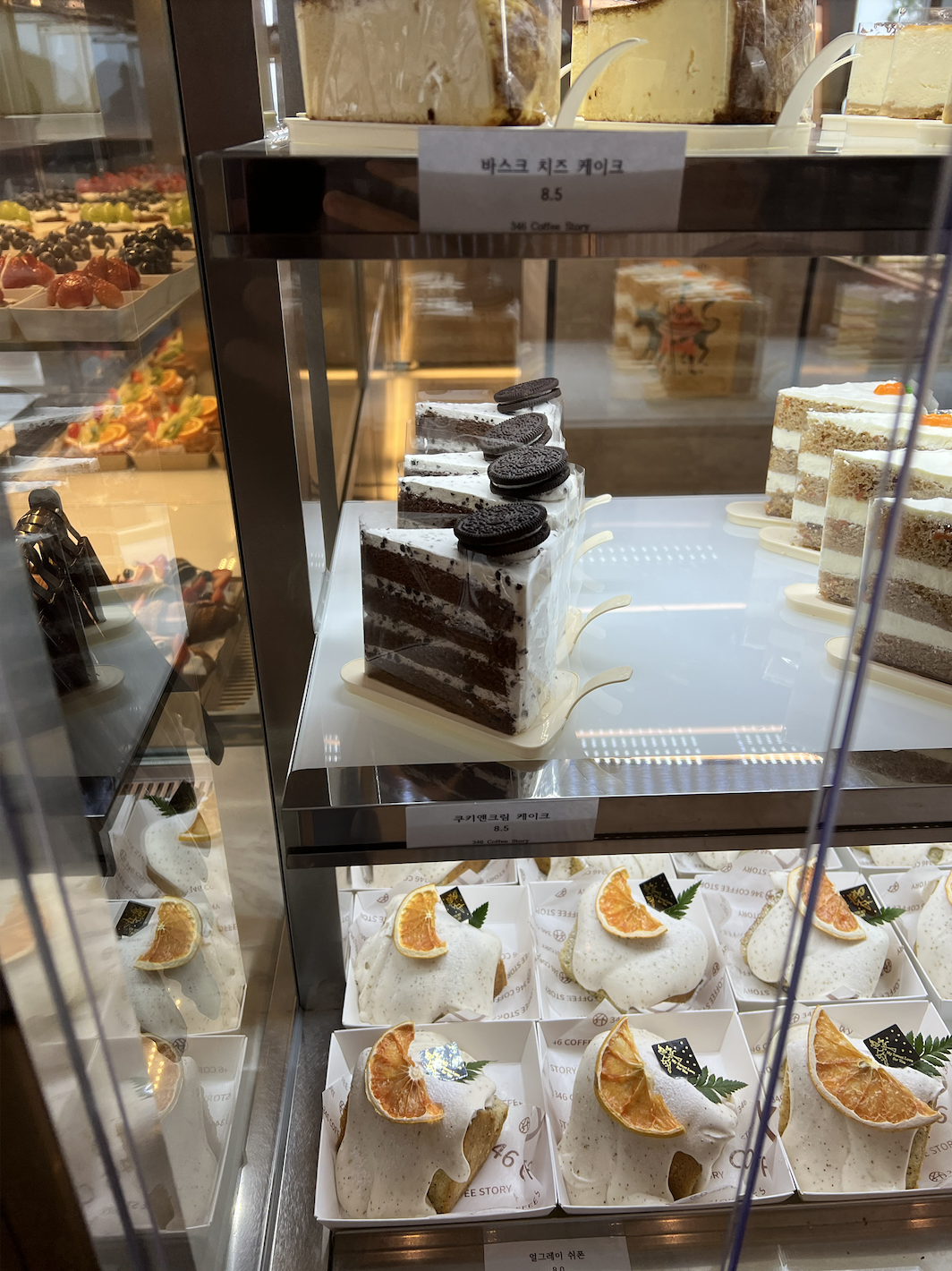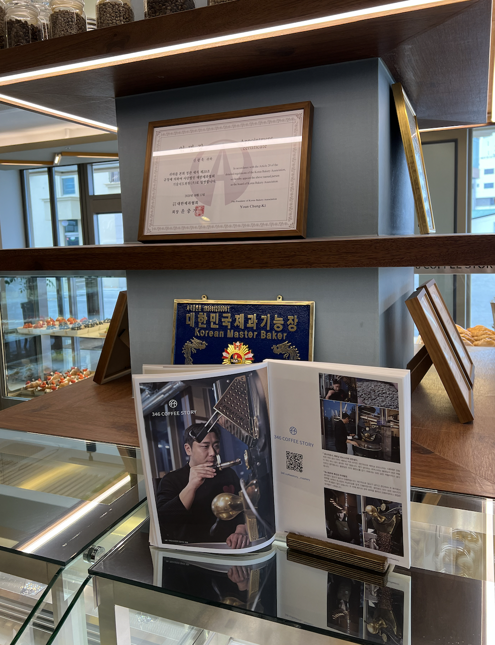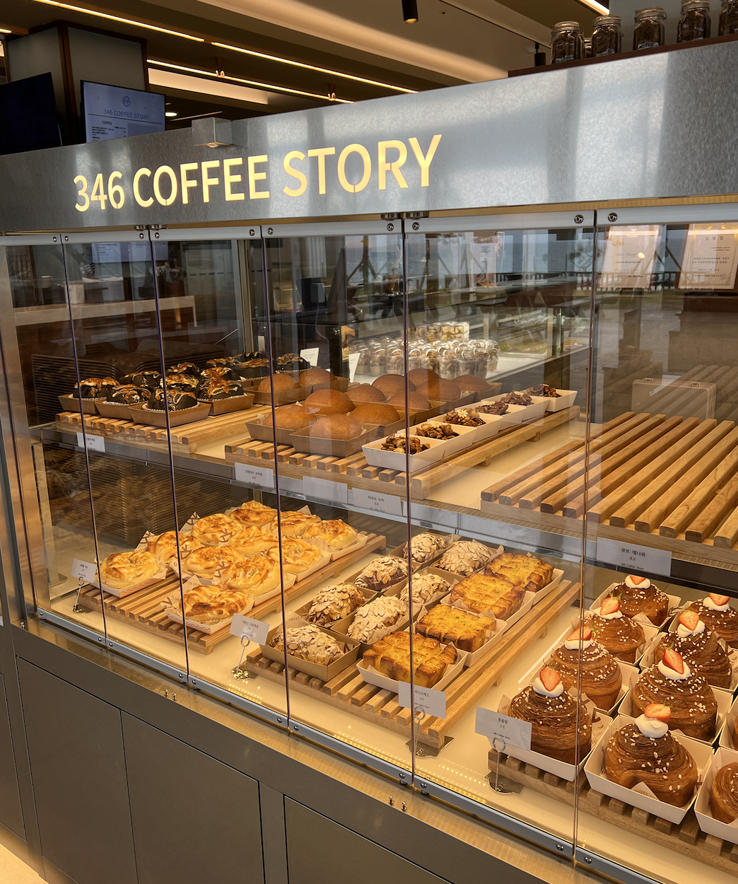 강문해변에는 스타벅스 외 많은 카페들이 위치하고 있는데 끝자락에 위치한 346 커피스토리라는 베이커리 카페이다. 일찍이 10시부터 많은 빵들이 나와있었고 커피가 정말 괜찮았다. 디저트 쇼케이스가 자동문인게 인상적이였다.
