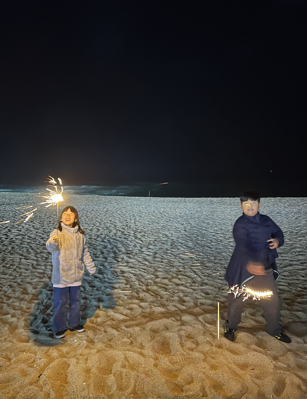 저녁이 되니 경포해변에 폭죽놀이하는 사람들이 많았다 주변 편의점에서 다 폭죽을 팔아서 어렵지않게 구매할 수 있었다.