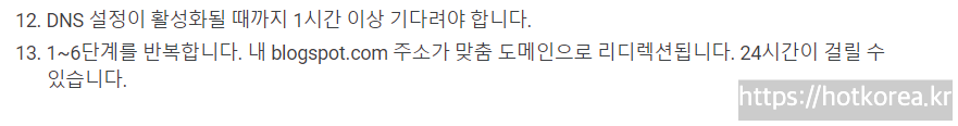 리다이렉션(자신의 홈페이지 주소를 입력하면 구글블로거로 연결되는것)까지는 24시간이 소요됩니다.