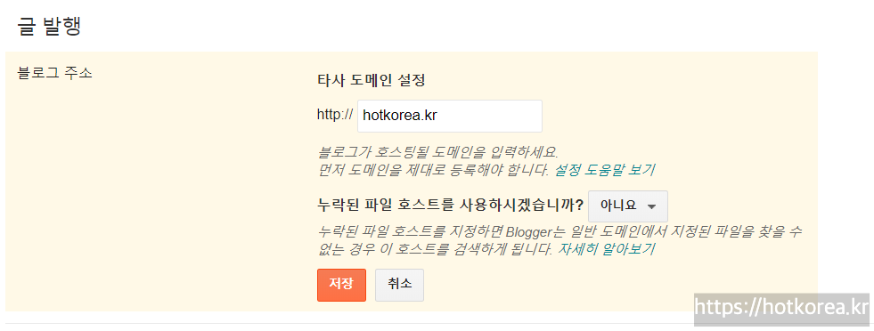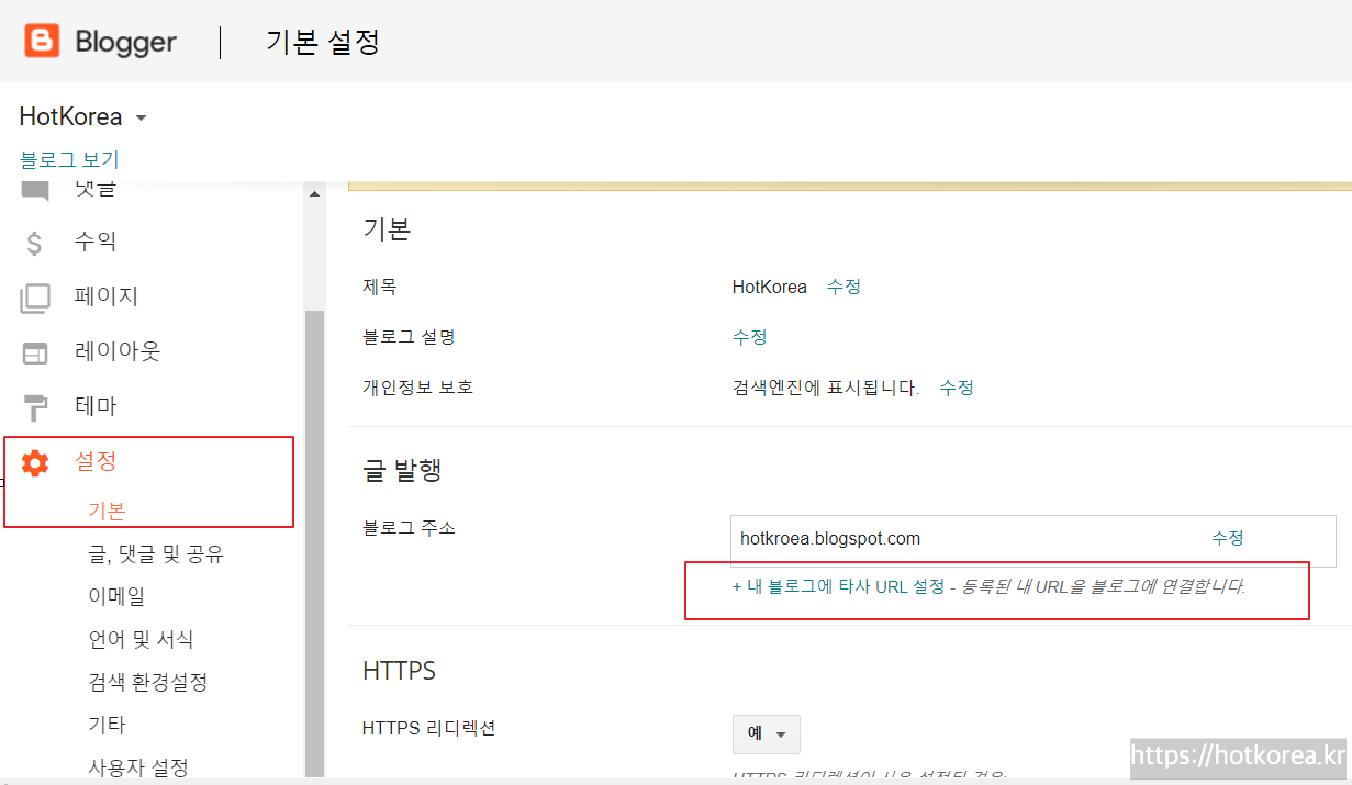 1. 구글블로거에 들어가서, 설정메뉴를 클릭하고 오른쪽에 *내 블로그에 타사 URL 설정을 클릭합니다.