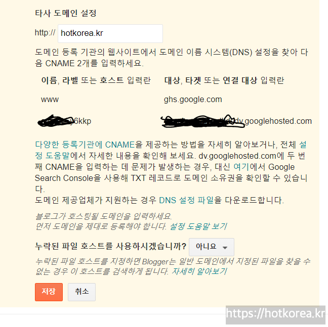 이렇게 CNAME을 추가하고 5~10분정도 지나서 다시 구글블로거 설정화면에 들어갑니다.