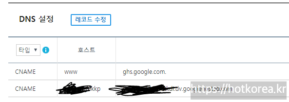 이제 구글블로거에서 안내한 CNAME에서 호스트에 www 을 입력 목적지, 타겟에 ghs.google.com을 입력해주면 됩니다.