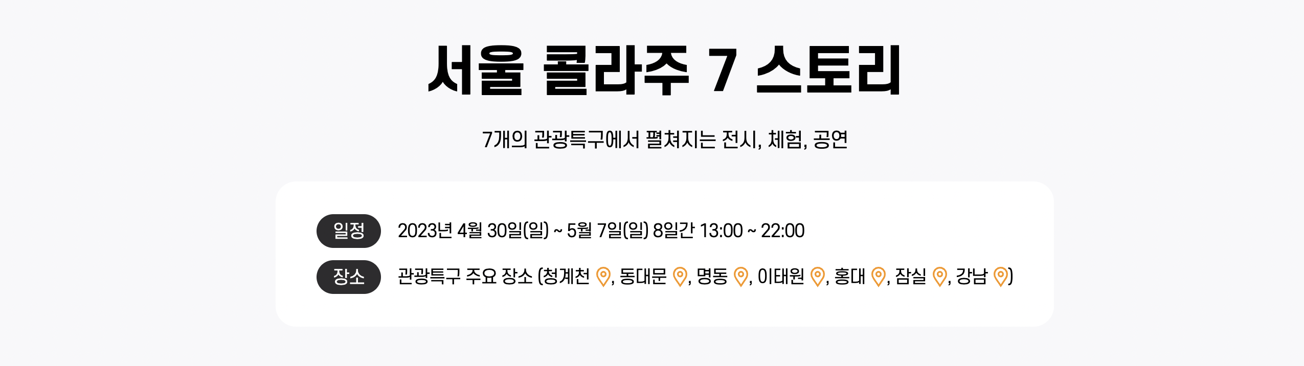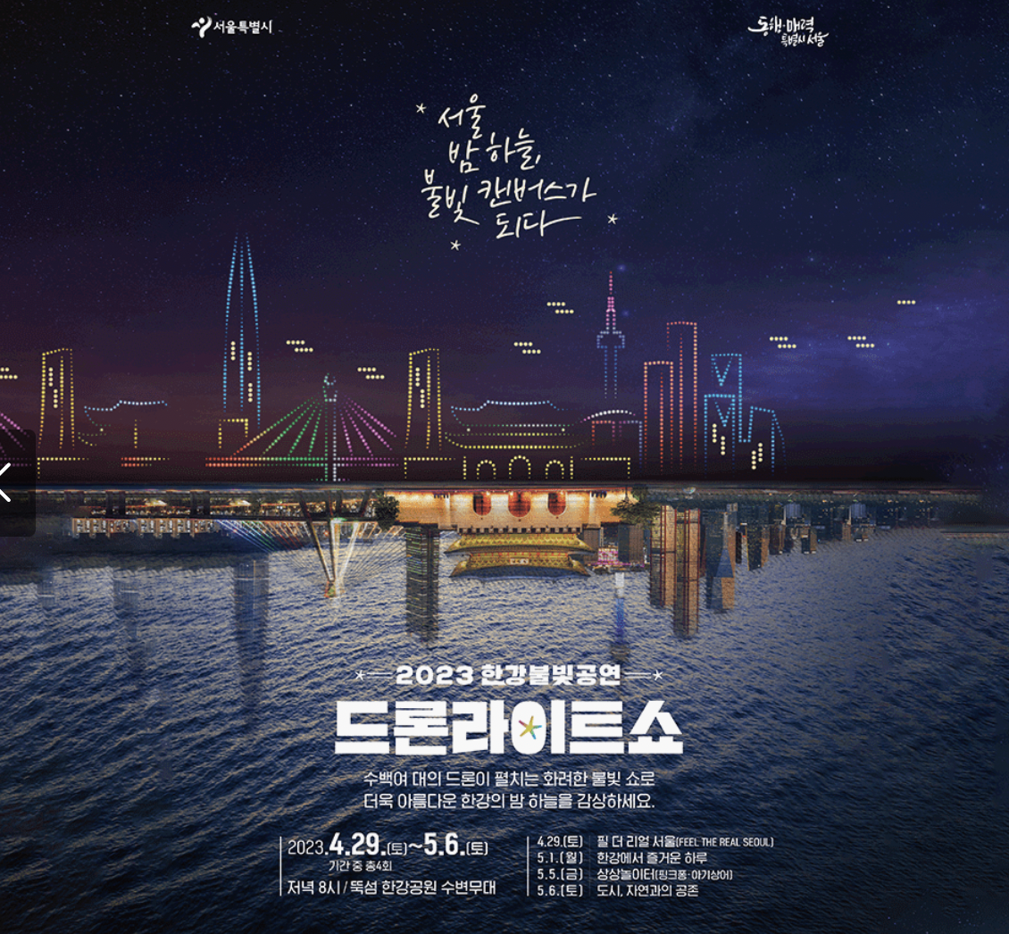드론쇼 외에도 아직 많은 이벤트들이 많이 남아있으니 5월 7일까지 뭐할지 고민이신 분들은 서울 전지역에서 진행하는 서울페스타 한번 가보시길 바랍니다. 청계천, 동대문, 명동, 이태원, 홍대, 잠실, 강남 7개 지역에서 지역 특성들을 사린 스토리텔링, 전시, 체험, 공연등을 지역별로 마련했다고 하니 가까운 지역들 이용하시면 서울문화체험에 상당히 도움이 되실것 같습니다.