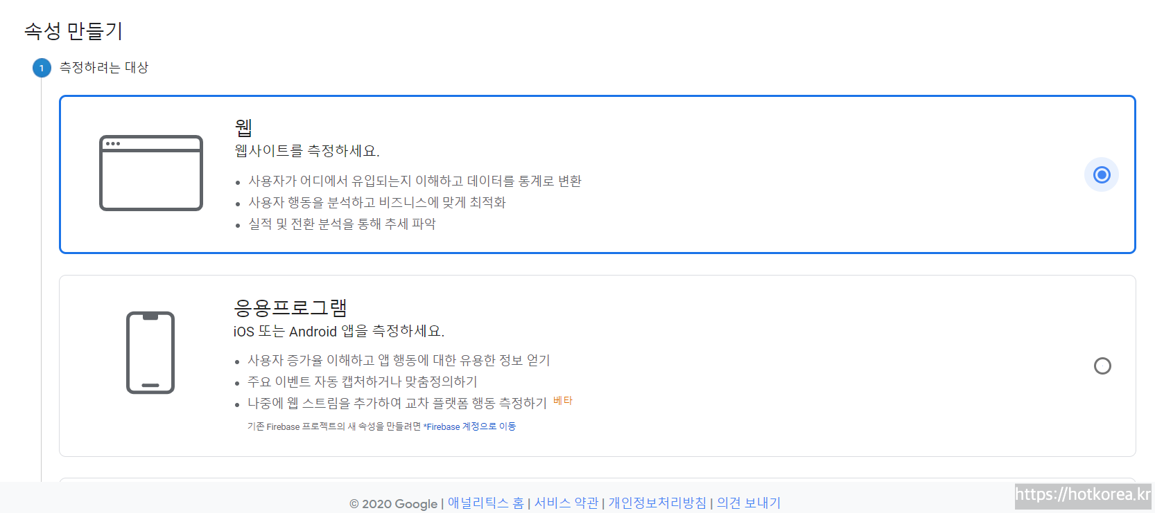즉 앱을 만들어서 앱에 대한 통계를 보려는 사람은 아래 응용프로그램을 등록하면 되는데 우리는 웹이므로 웹 클릭.