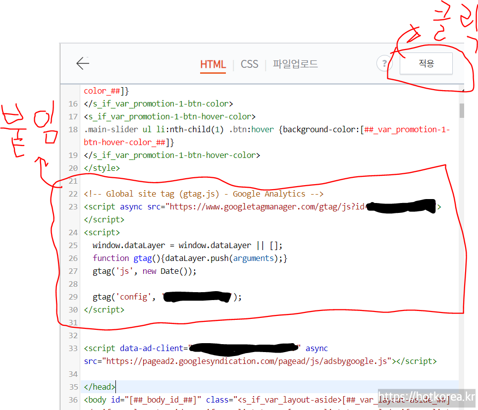 구글애널리틱스에서 복사한 코드를 head 태그 위에 붙여넣기하고 상단오른쪽에 적용을 클릭하면 끝.