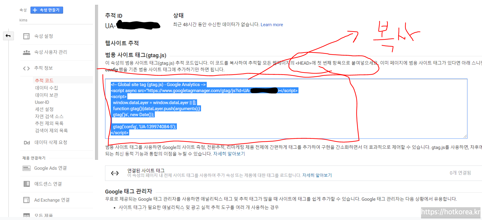 그리고 범용사이트 태그가 있는데. gtag.js인데 이중에서 아래에 빨간 네모 부분을 모두 복사해서 티스토리 head태그 사이에 넣으면 된다. 티스토리에 넣는 부분은 아래에 설명.