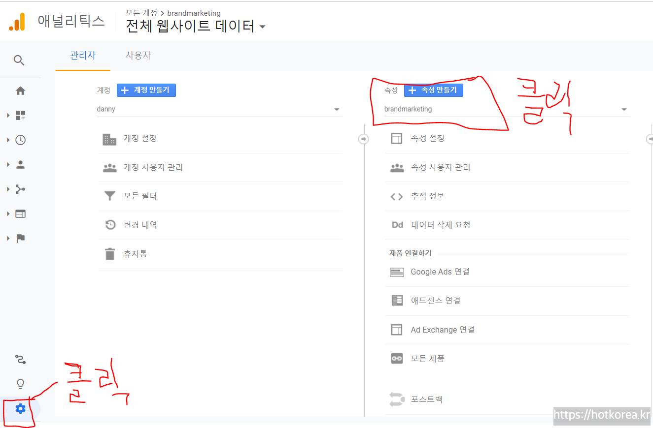 1. 애널리틱스 홈페이지 왼쪽 하단에 관리메뉴를 클릭하면 아래와 같은 화면이 뜬다.