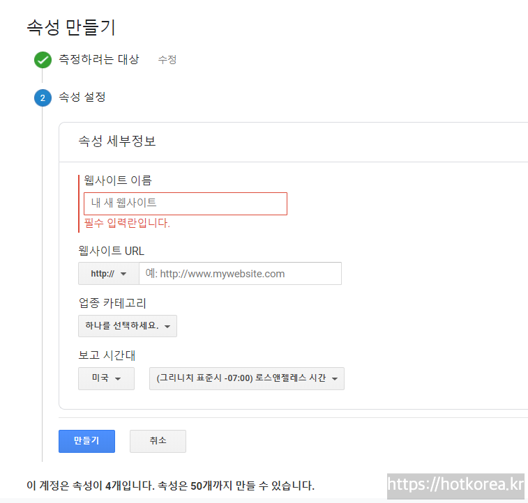 이 부분이 사이트를 추가하고 관리하는 부분이다. 속성만들기 클릭.