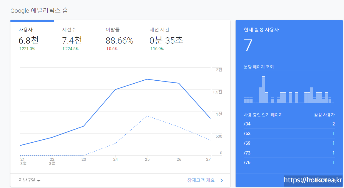 아래와 같이 사용자들이 얼마나 방문했으며 이탈율등이 표시된다.