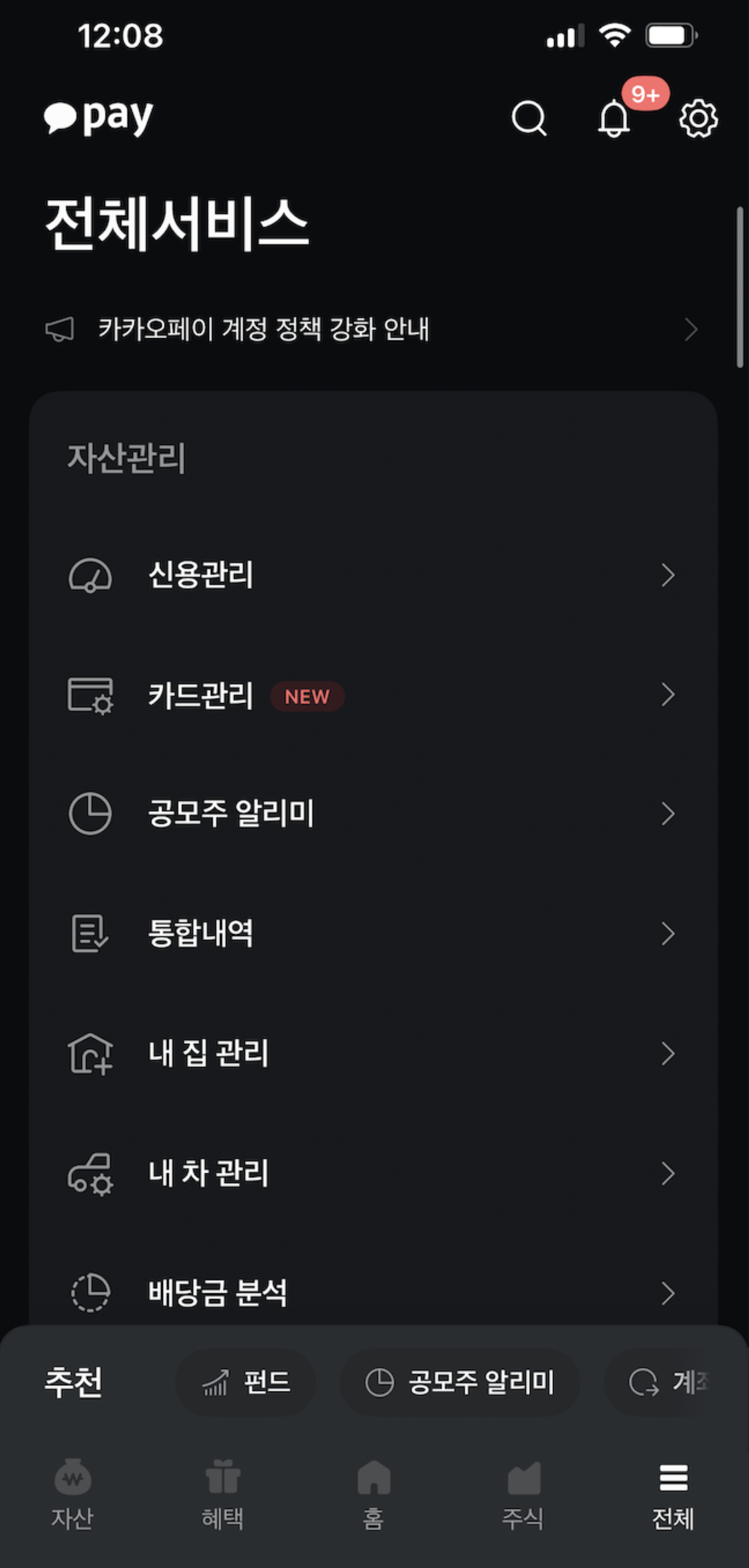 공모주 알람을 알려주는 다양한 앱이 있지만, 가장 쉽게 알람을 신청하는 건 카카오페이다. 대부분 가지고 있는 카카오 페이 앱페이지에서 전체서비스-공모주 알리미를 선택한다.