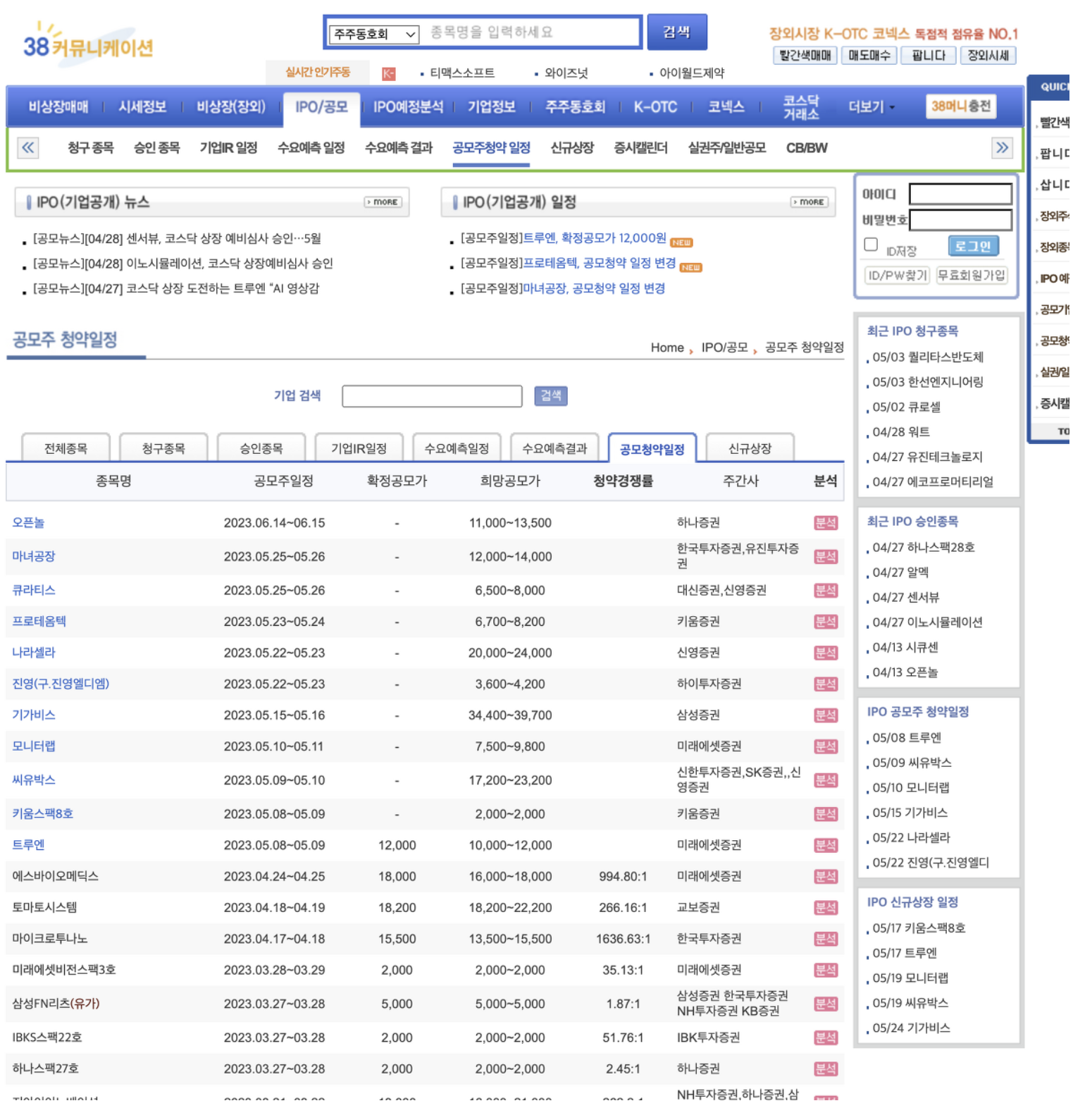 38커뮤니케이션 홈페이지의 공모청약일정 탭을 확인해보면 공모주의 일정을 확인할 수 있다.