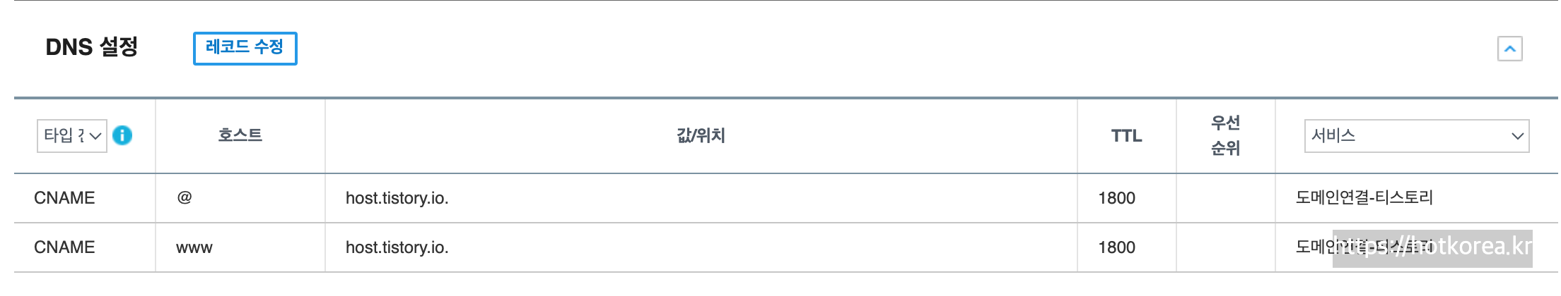 - 타입 : CNAME, 호스트 www 값/위치 : host.tistory.io, TTL : 1800