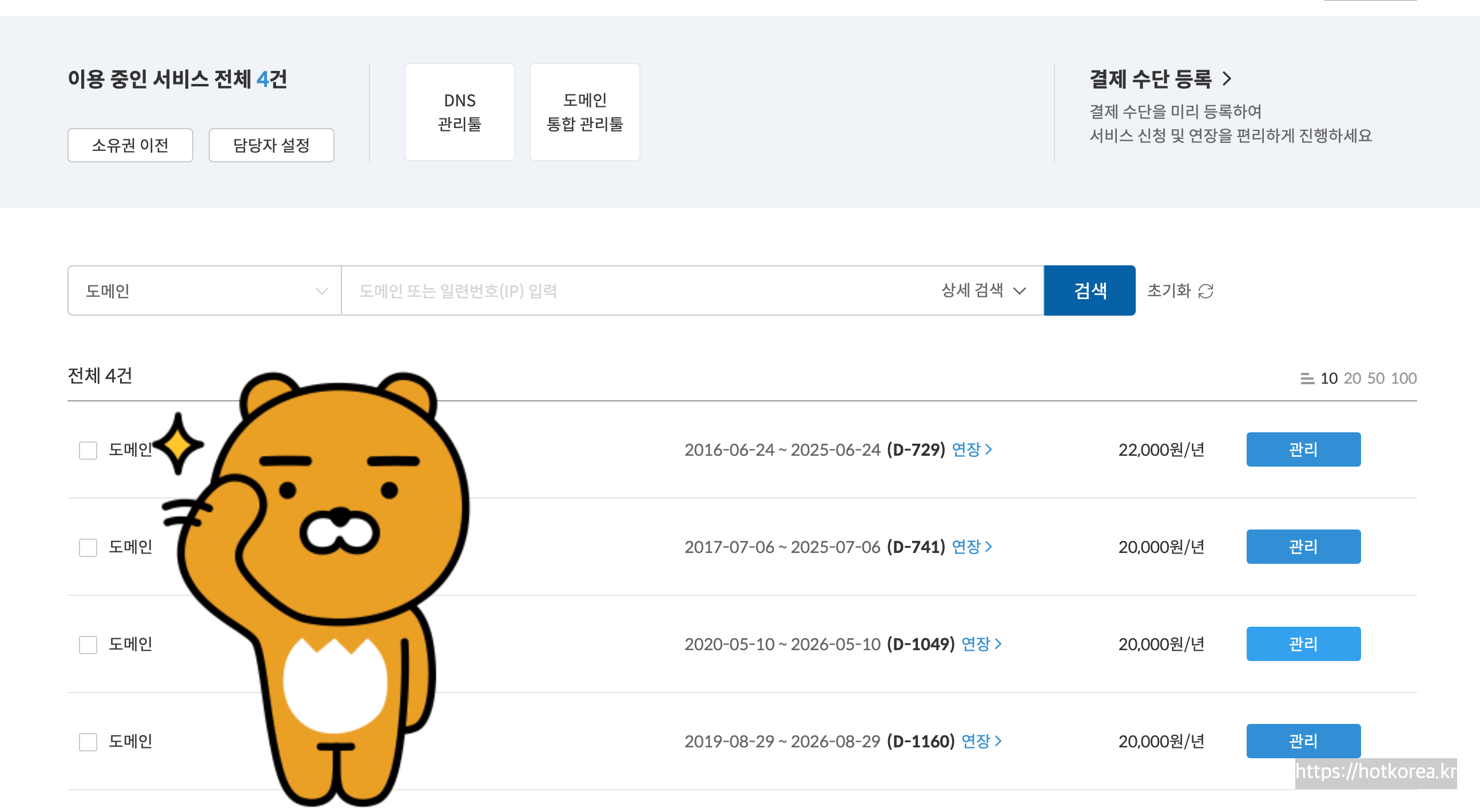 가비아 도메인 구매후 홈페이지에서 관리탭(서비스관리)을 들어가면 아래와 같이 보여진다.