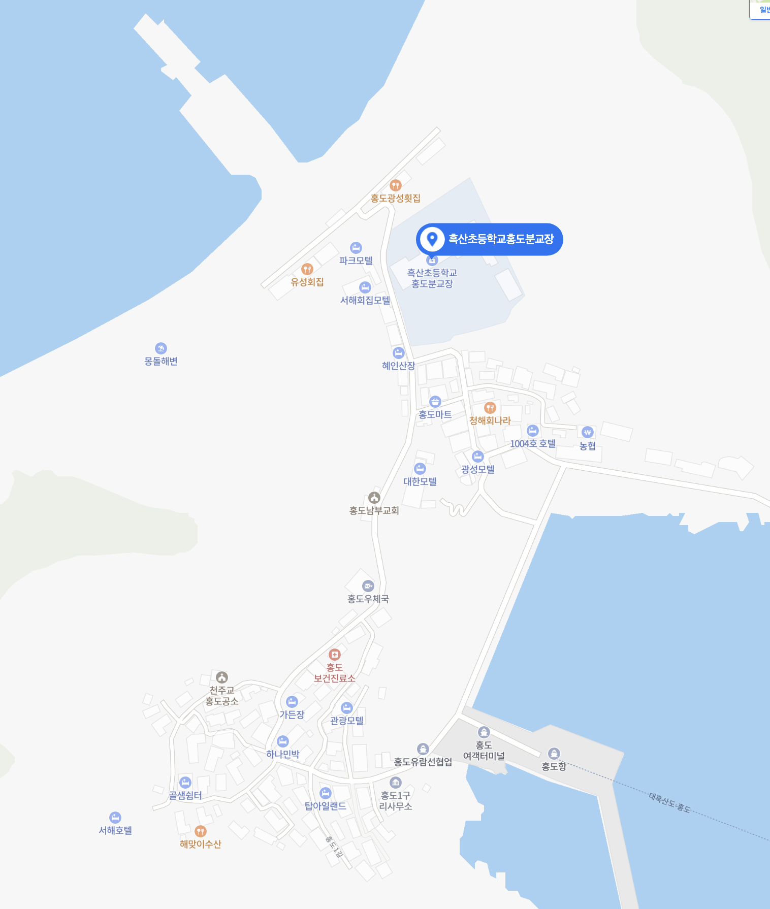 마을의 중심에 학교가 있다. 그리고 학교 근처를 보면 필요한건 다 있는것 같고..끝에 홍도여캑터미널, 그리고 홍도항이 보인다.
