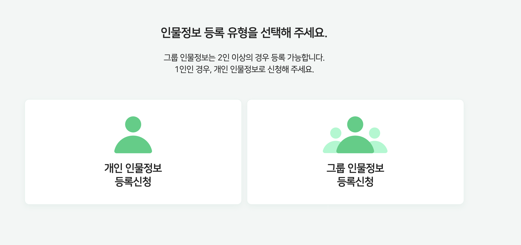 3. 개인,그룹 등으로 등록 신청.(1인인 경우 왼쪽)
