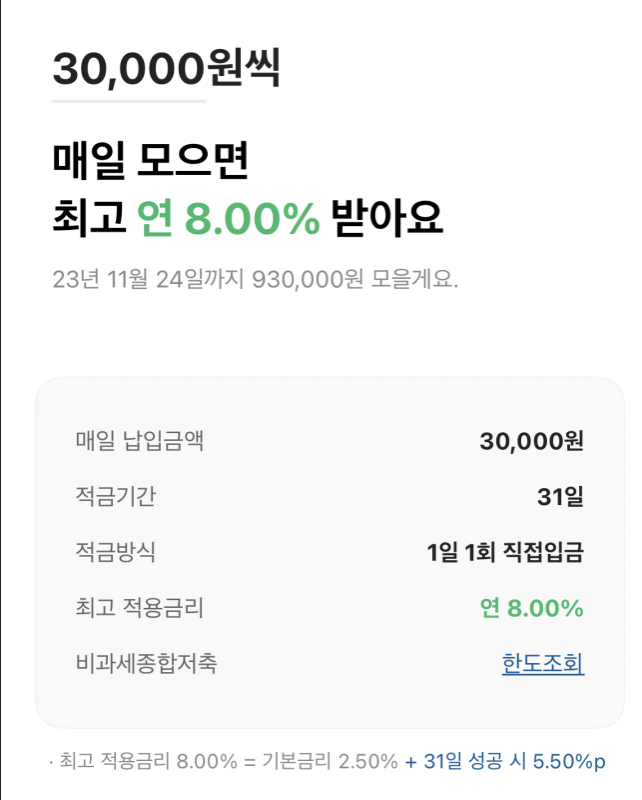 기본 연 2.5%인데 매일 꾸준히 적금을 넣으면 최고 연 8%대로 이자를 준다.