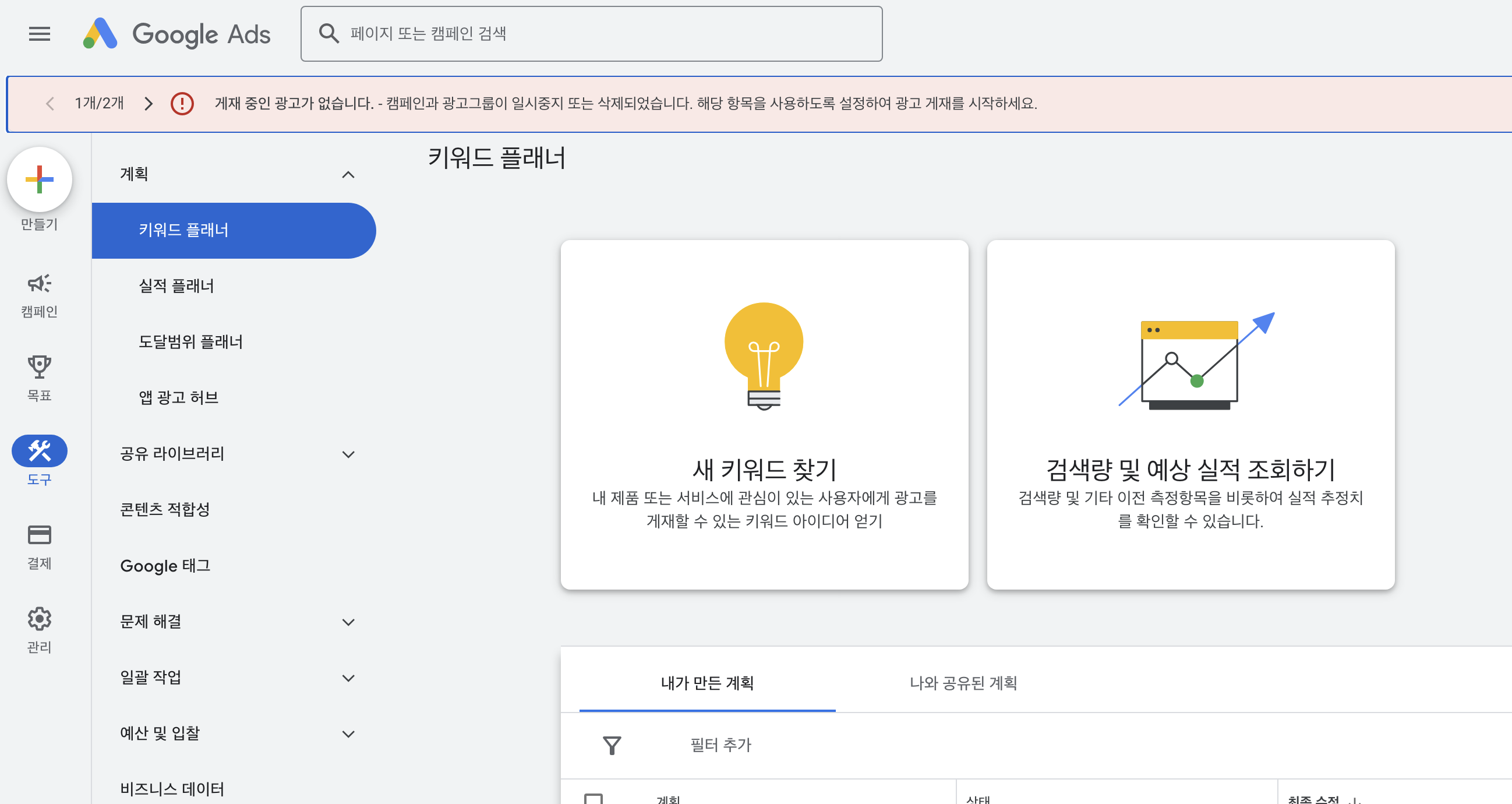 - 키워드 플래너로 이동하면 아래와 같은 화면이 보인다.
