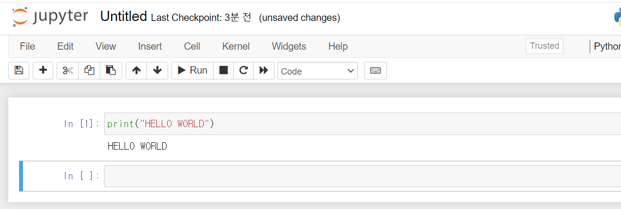 - 입력창에 print("Hello World") 를 입력후 상단 메뉴에 RUN을 실행한다.