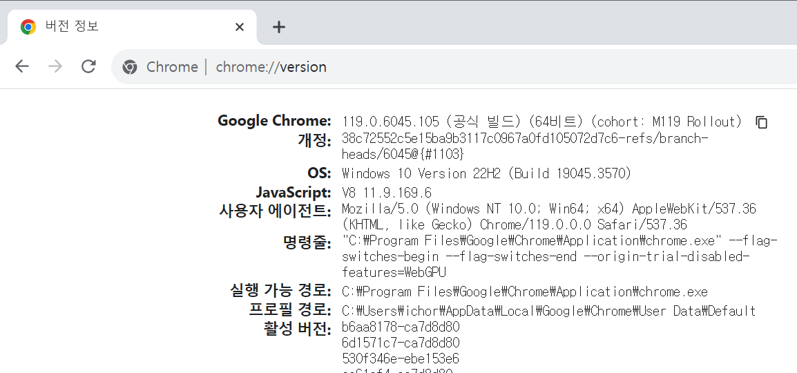 - 크롬창을 띄우고 아래와 같이 chrome://version 을 입력하면 아래와 같이 버전이 나온다.