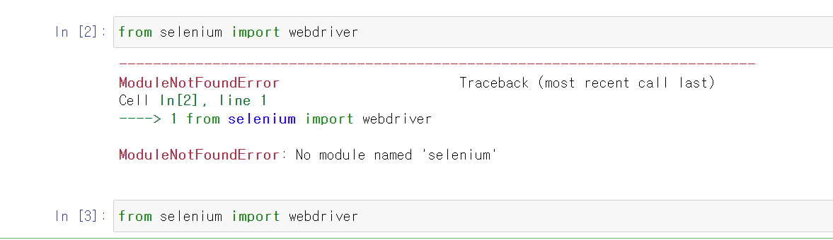 위의 그림과 같이 ModuleNotFoundError : No module named 'selenium'이라고 뜨면 설치가 정상적으로 안된거다.