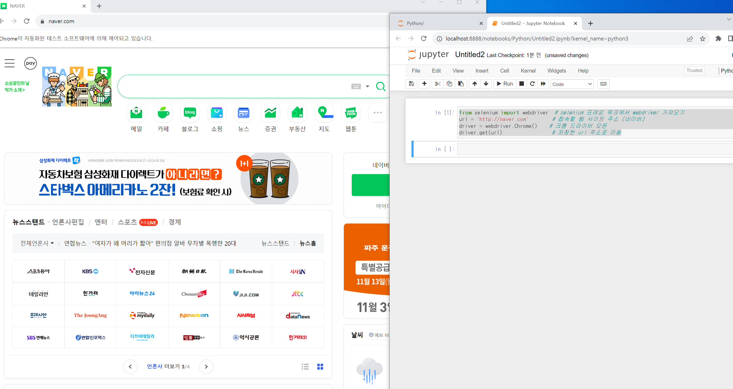 - 크롬 브라우저가 열리고 네이버가 오픈된걸 확인할 수 있다!!