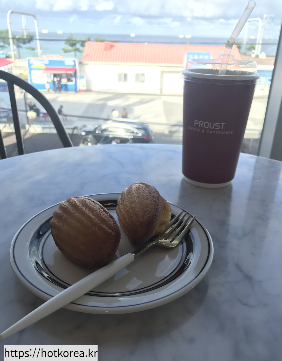 정동진역에서 바로 도로 건너편을 보면 2층에 최근에 지어진 괜찮은 분위기의 까페가 하나 있다. POOUST란 곳인데 커피맛도 괜찮고 분위기도 좋다. 정동진역에서는 여기가 가장 분위기가 괜찮은듯 하다. 2층에 있고 커피와 마들렌을 두개 시켜봤다. 둘 다 나쁘지 않다. 여기서 정동진역도 보이고 바다 뷰도 괜찮아서 커피와 함께 정동진역의 분위기를 즐기기에는 최적의 장소인듯 하다.