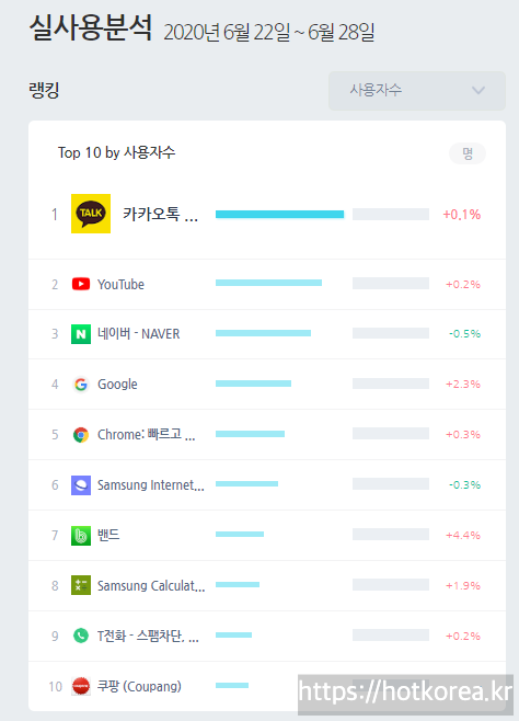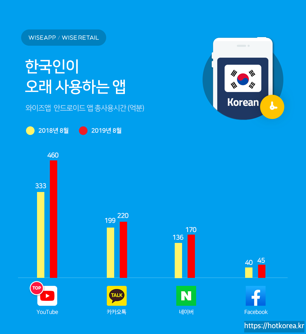 전 세대를 합쳐 한국인이 가장 오래 사용한 앱은 YouTube로 8월 한 달 총 사용시간이 460억 분이었다. 그 뒤를 카카오톡 220억 분, 네이버 170억 분, Facebook 45억 분의 순이었다.